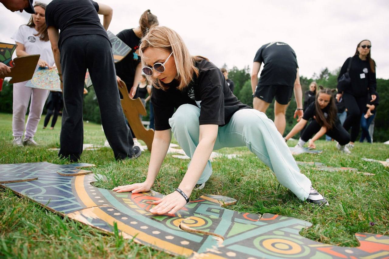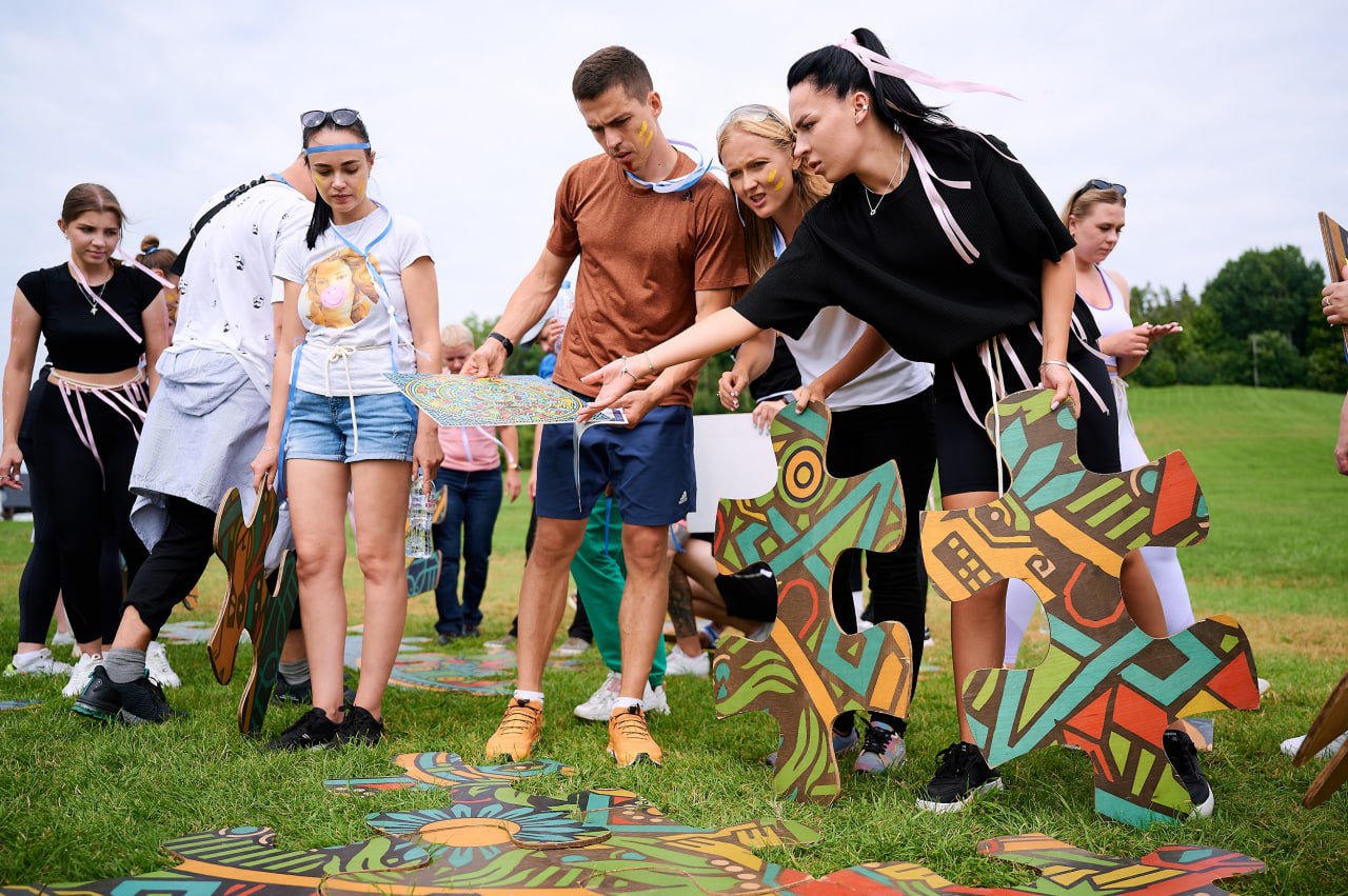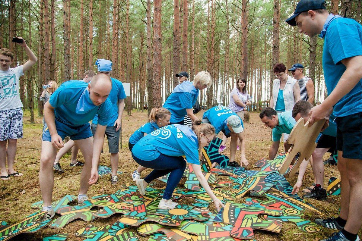 - задача — собрать гигантский пазл из крупных элементов, используя картинку‑подсказку;