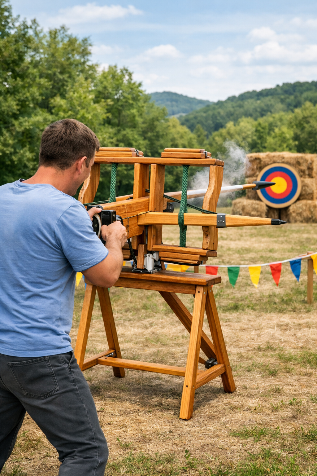 Эффектный аттракцион, вдохновлённый древнеримской метательной машиной. Участники заряжают снаряд, натягивают тетиву и делают выстрел по мишени — проверяя силу, меткость и командный дух. Конструкция выполнена из дерева и канатов, стилизована под античное оружие, но полностью безопасна.