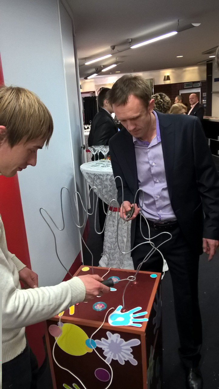 Этот интерактивный аттракцион представляет собой металлический контур в форме руки, по которому участнику нужно провести металлическое кольцо, не касаясь проволоки. При соприкосновении с контуром срабатывает звуковой и световой сигнал, что добавляет игре азарта и сложности. Игра отлично развивает концентрацию, моторику и внимание.