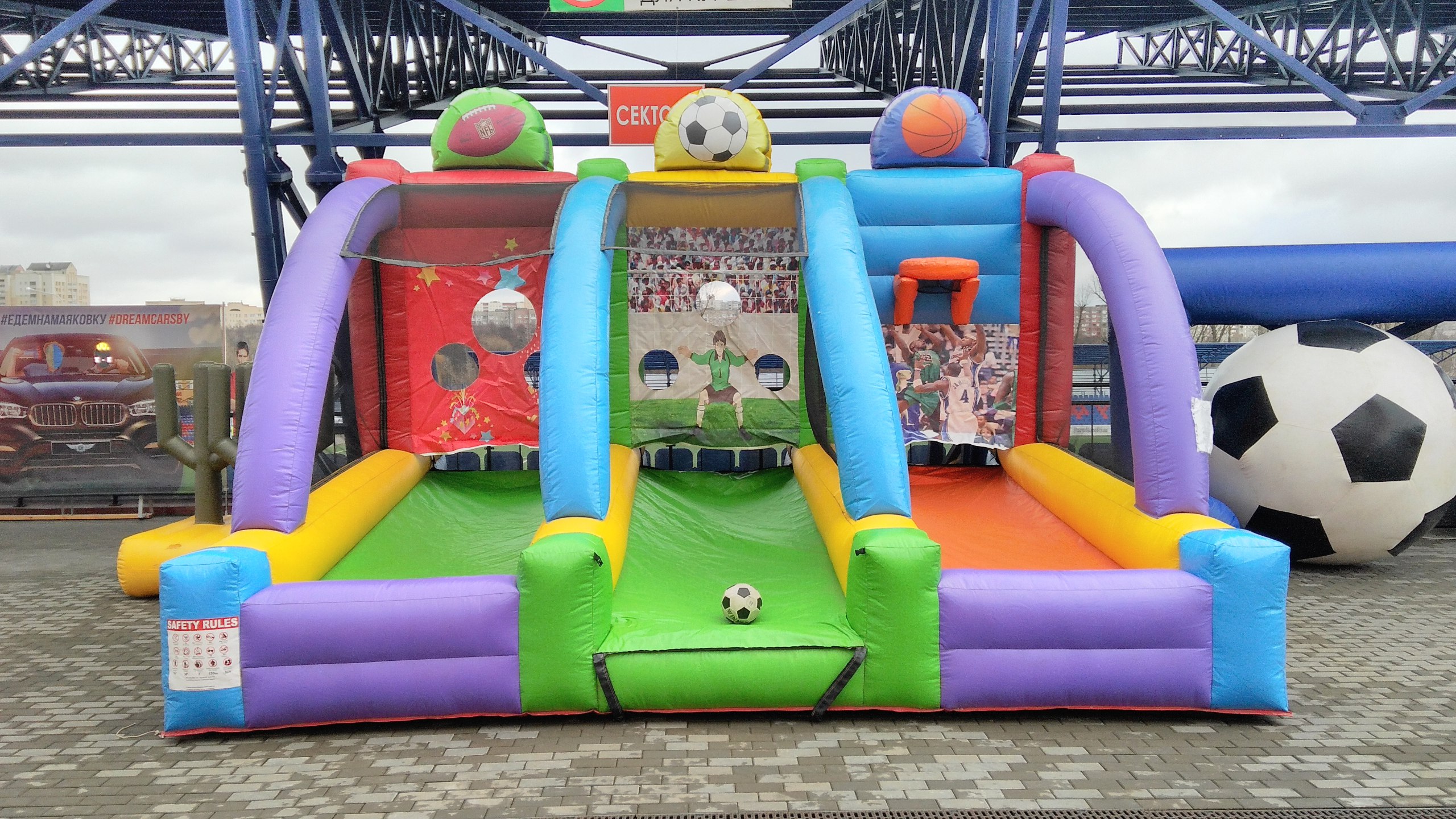 Превратите любое мероприятие в настоящий спортивный праздник с комплексом игр «3 в 1»! Аттракцион объединяет три популярные игры — баскетбол, футбол и американский футбол — и позволяет каждому гостю почувствовать себя спортивной звездой. Идеально подходит для детских дней рождения, корпоративов, тимбилдингов и массовых мероприятий. Яркие эмоции и азарт гарантированы!