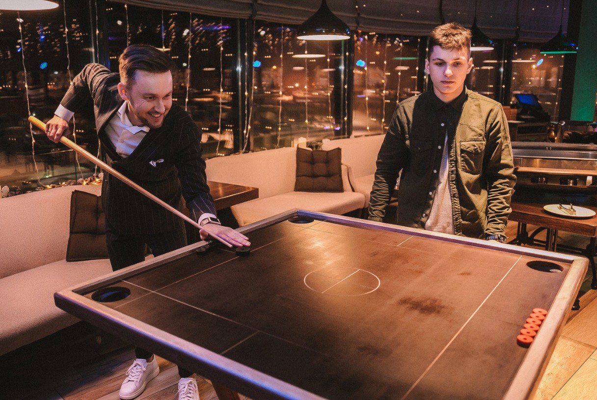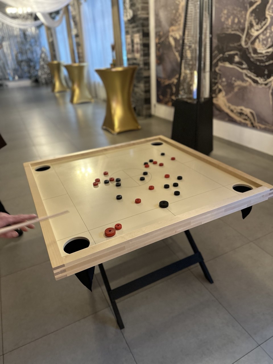 Аттракцион «Скандинавский бильярд (Новус)» — аренда и прокат для праздников, корпоративов и детских дней рождения по всей Беларуси. Игроки соревнуются за квадратным игровым столом, разделённым на четыре зоны, где с помощью кия и битка нужно загнать свои фишки в угловые лузы быстрее соперника. Наш аттракцион выделяется глубокой тактикой, точностью ударов и азартом классического бильярда, но в компактном и динамичном формате, который подходит для гостей любого возраста.