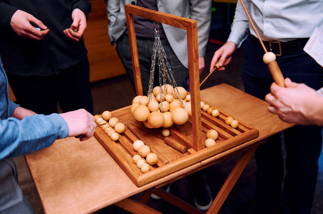 Настольная игра «Галактика» — аренда и прокат для праздников, корпоративов и детских дней рождения по всей Беларуси. Участники по очереди размещают деревянные шарики на подвешенной конструкции из крупных элементов, стараясь избавиться от всех своих шариков, не нарушив баланс и не разрушив конструкцию. Игра развивает ловкость, внимание и чувство равновесия, создавая атмосферу дружеского соперничества и весёлого азарта. Наш аттракцион выделяется эффектным внешним видом, безопасностью и универсальностью для гостей любого возраста, превращая любое мероприятие в яркое и запоминающееся событие.